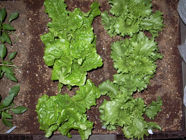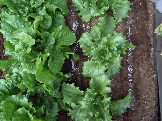 右は下葉を収穫したあとの様子です(夜間撮影)。株間の風通しがよくなりました。写真ではよくわかりませんが、レタスが結球しはじめています。