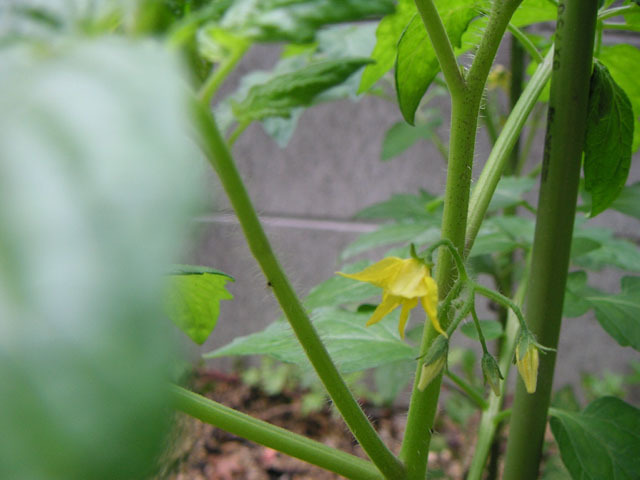 今朝、雨の中でミニトマトを見ていて「ガーン!!」。なんと、三株の一本の茎が一番花の上でちぎれています。切り口をよくみると、少し茶色になっていて、今日や昨日のできごとではなさそうです。