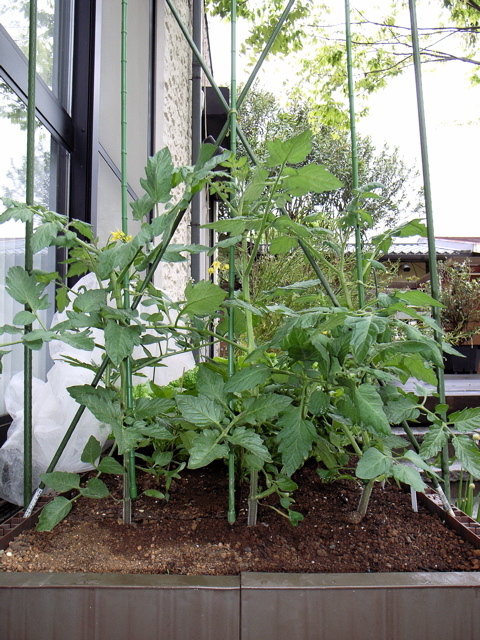 ミニトマトの成長が勢いを増してきました。花も付きはじめました。現在、丈は約40cmくらいです。