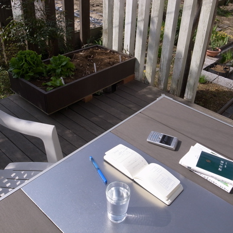 日差しがとっても暖かかったので、久々に、本を抱えてクッキンガーデンのテーブルに着きました。といいつつ実態は、休日恒例の全館開けっ広げての掃除で、部屋にいても外と変わらないからです。それに、邪魔者扱いされますからね〜(笑)。
