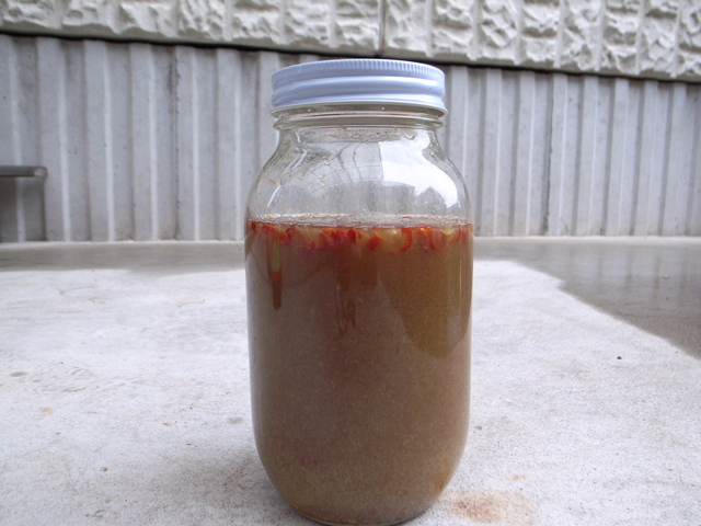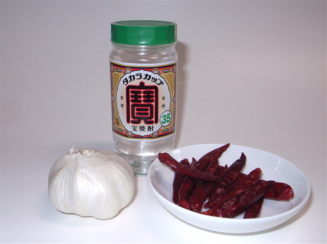 それで今回は、沸騰しないようにゆっくりと時間をかけて煮出し、アルコール分を残した状態で徐々にニンニクとトウガラシの成分が抽出されるようにしました。期待はそうですが、じっさいにそうなったかどうかは・・・アバウトですいません(笑)。