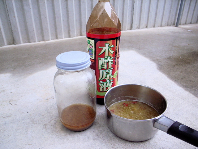 作り方の基本は前回と同じ。ニンニク、トウガラシ、アルコール飲料、木酢液の混合です。新しくしたのは煮出し方です。前回は材料を混ぜた液体をグツグツと煮詰めて濃度を上げました。これだと、アルコール分は飛んでしまうでしょうね。