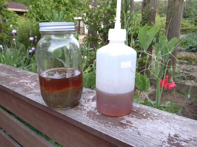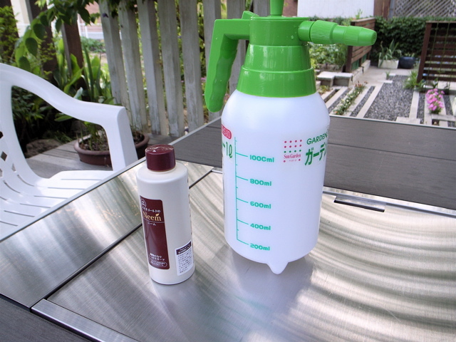 この液をスプレー容器にとり希釈します。何倍に希釈するかですが、これは実際にやってみて決めるしかなさそうです。最初は100倍くらいに薄めていましたが、植物に害が出ないのを確認しながら、現在は20倍まで濃くなっています。