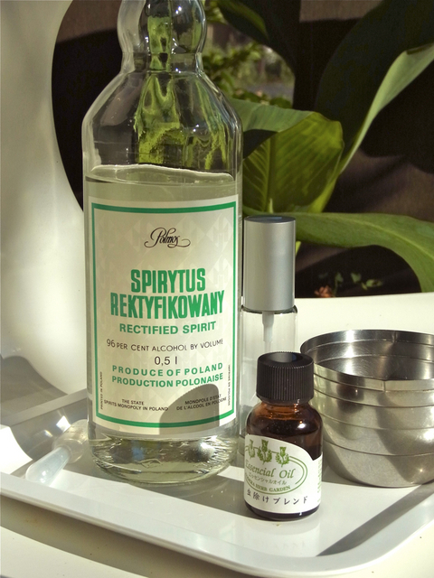 そんな軽いノリで買い求めたオイルとスプレーボトル。紙切れに書かれたレシピがすばらしい。精製水45ml、ウオッカ5ml、オイル5滴! とある。いいなあ、こういうノリ^^/