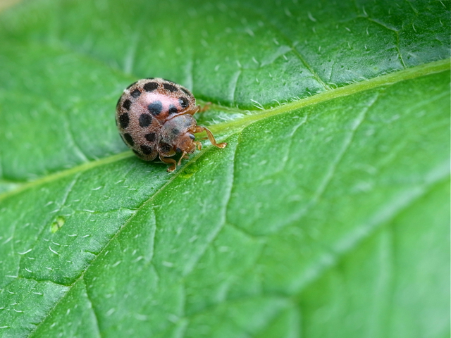 庭のジャガイモの大敵、オオニジュウヤホシテントウ。放っておくと、ジャガイモの葉っぱが穴だらけになります。