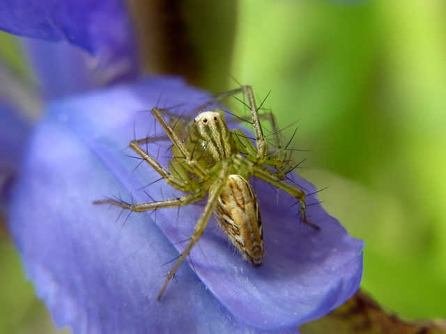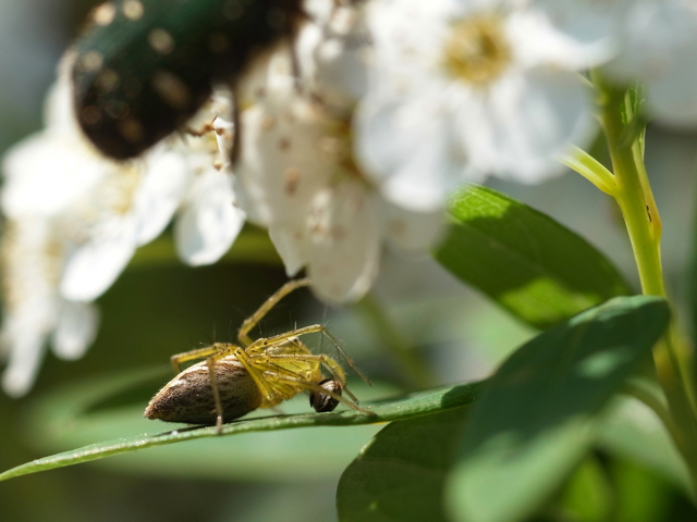 5月に入って、庭のあちこちでササグモを見かけるようになりました。こんなに姿が丸見えでも、ちゃんと獲物が捕れるということは、獲られる方の視野が狭いのかな。