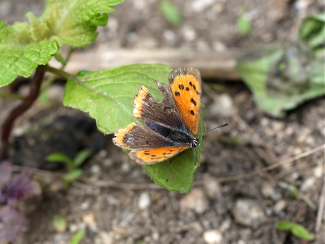 庭のベニシジミ。何やら戦いの跡が。相手はシオカラトンボか?