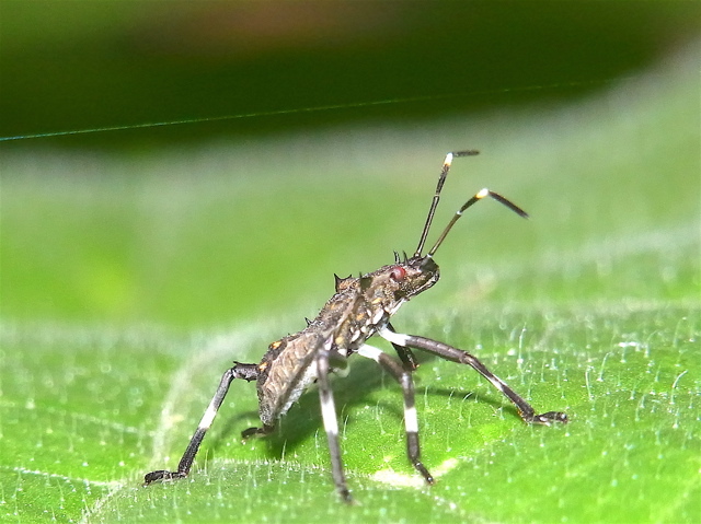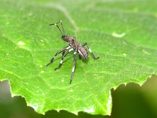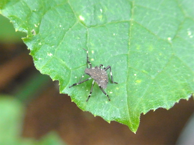 うまく真上から撮れなかったので、ちょっと自信がありませんが、たぶんクサギカメムシの2齢幼虫くらいではないかと思います。キュウリの葉の上で、出社する前の5時半ごろに見つけました。