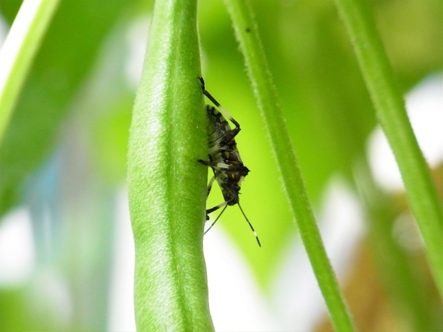 先日、キュウリの葉の上でクサギカメムシを見つけましたが、今日はおなじプランターの中のインゲンの実にしがみついたクサギカメムシを見つけました。