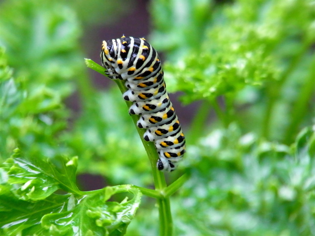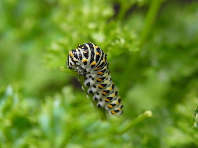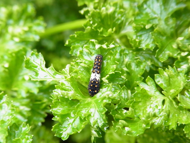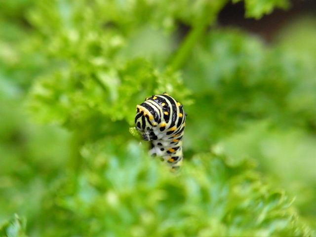 昨年も梅雨の季節にパセリにやってきたグリーン・ブルドック^^が、ことしもやってきました。パセリを丸裸にする、その意味では害虫ですが、姿が憎めないうえに、チョウになったときのことを思うと「大きくなれよ」と思ってもみたり^^