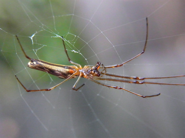 最初のは「アシナガグモ」です。足も長いけど、体も長い。イエグモなんかと似て益虫(虫じゃないのに^^)といわれますが、網を張るのでハエとかウンカといった飛翔する虫を捕獲するようです。