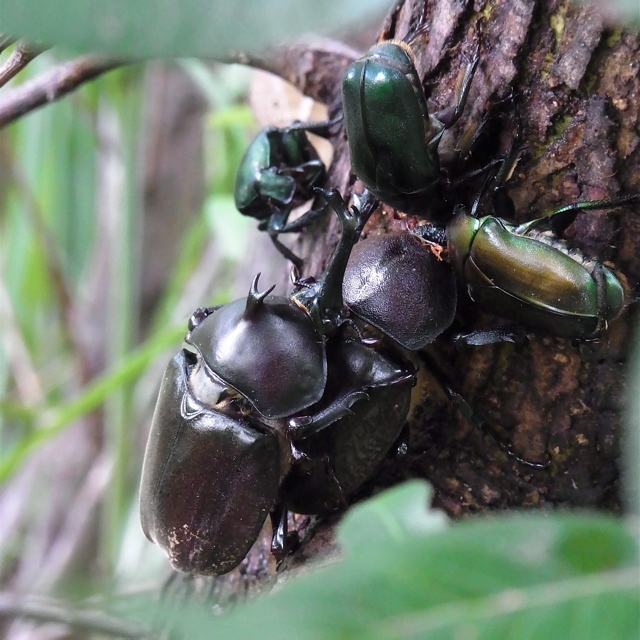 散歩道でカブトムシを見つけました。最初は青カナブンと黒カナブンが群れていたのですが、いつの間にかオスとメスのカブトムシもやってきました。よぼど蜜がいっぱいあるのでしょうね。