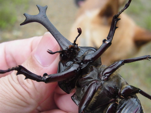 撮影しているとオスが飛び立ち、とっさに妻が日傘で捕獲。地面にコロリと転がったカブト。危うく我が家の「モモ」の餌食になるところでした(笑)。