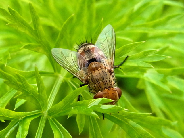 これは菜園のニンジンの葉の上で撮影したものです。さて、お前はハエかアブか? 噛ませてみるか、吸わせてみるかと思案する前に、とりあえずカシャ。