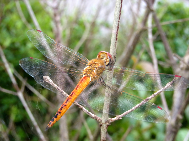 散歩道で見つけたシオカラトンボの雌です。シオカラトンボといえばどうしても、青地に白く粉を吹いたような雄を思い浮かべますが、こちらは雌です。