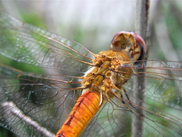おかげで拡大写真を撮ることができました。よく見ると、翅ごとに3本の翅脈と腱があるのがわかります。筋肉収縮のわずかな位相差で翅のピッチを変え、自由に飛翔していることを伺わせます。庭でこういう観察ができるのは、ほんとにいいなあ^^/