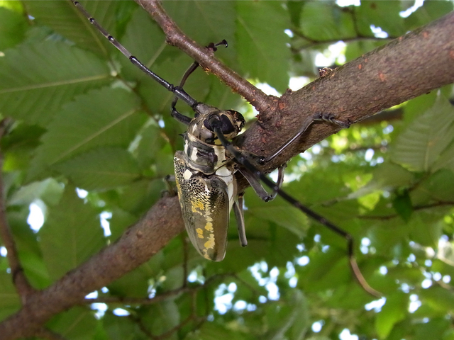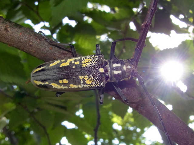 昔はゴマダラカミキリムシとともによく目にしましたが、いまでは年に1〜2回目にするかどうか。ミカンやクワの木を食い散らすので、数が多いと害虫扱いにされますが、これだけ減ると「よく生きてたね〜」という気持ちも。