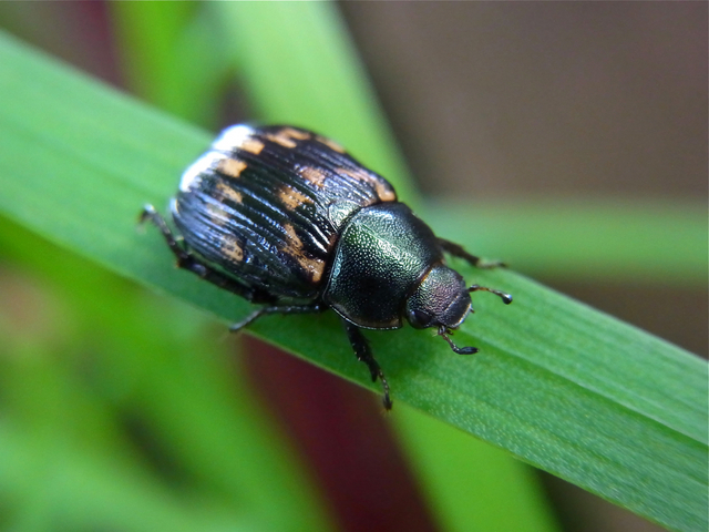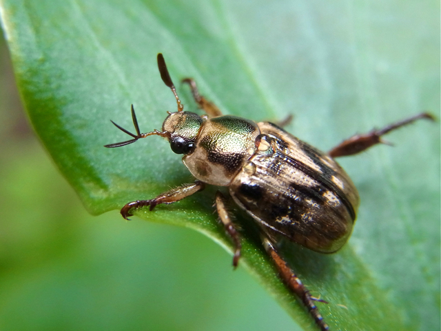 たぶん、アオウスチャコガネの雌かな。メダカのいる庭の水草の上で見つけました。アンテナがかわいい。