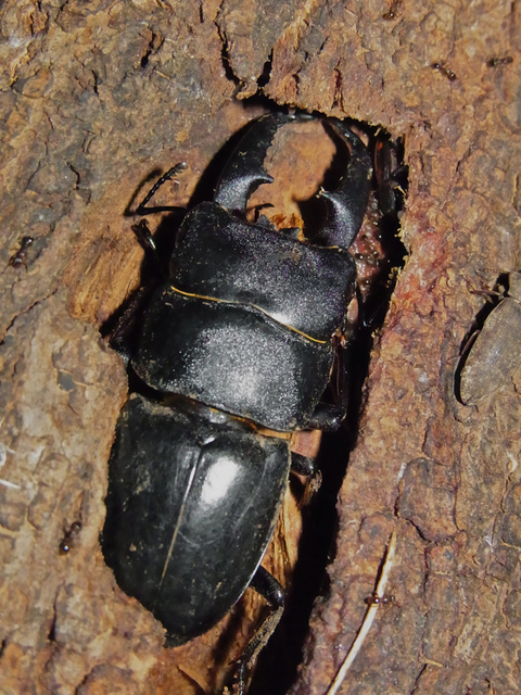 散歩道の樹液スポットにいた、たぶんヒラタクワガタです。6月の初めごろから見かけるようになりました。でも、なかなか写真に撮るのがむずかしく、夜間に不意打ちしてやっと写真に納めることができました。