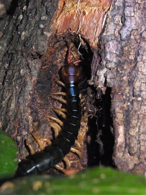 樹液スポットには、他の虫たちも餌を求めていっぱいやってきます。右の写真は実に立派なムカデです。写真にもまったく動じず、黙々と樹液を食べています。