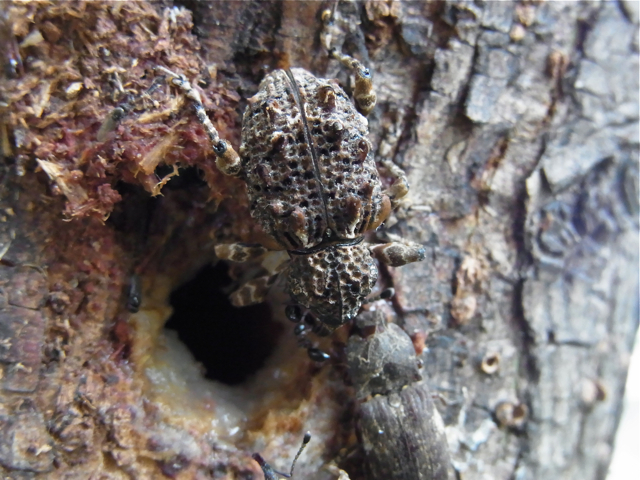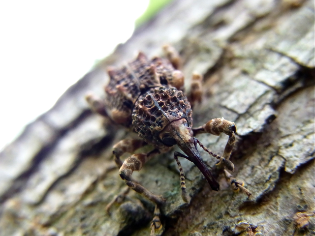 同じく、樹液スポットでよくみかける虫のひとつ、マダラアシゾウムシです。いったいこの造形、どうなっているのでしょうね。見ているだけで頭の中がグチャグチャになりそうです。姿があまりにも凄いので、かえって、この鎧をとったら中はツルツルの柔肌ではなかろうかと妄想が膨らみます^^ 進化の過程で獲得した擬態だろうとは思いますが・・・その上、しっかり擬死も見せます。