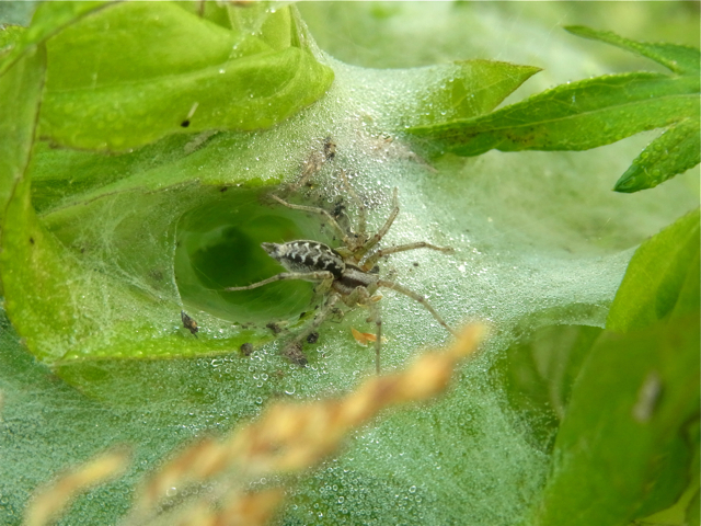 Wikipediaには、棚網のトンネルの底に穴があり、そこから出入りするとありますが、この写真のクモはトンネル入り口の穴から出入りしていました。勝手口でしょうか?^^