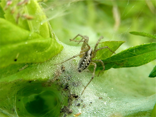 散歩道で見つけたクモです。ササグモとよく似ていますが、棚網から出て来たので、たぶんクサグモです。ササグモは網を張らない徘徊性のクモなので。