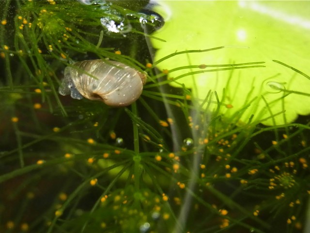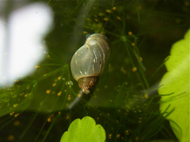 水鉢のなかに貝類がいるとは思いもよらず、ついあまり調べずにツイッターで「庭にタニシがいた!」と画像を投稿したら、「タニシではありません。モノアラガイ」ですと教えていただきました。
