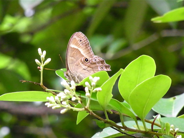 散歩道の高い木の枝にいました。たぶん、ヒカゲチョウです。