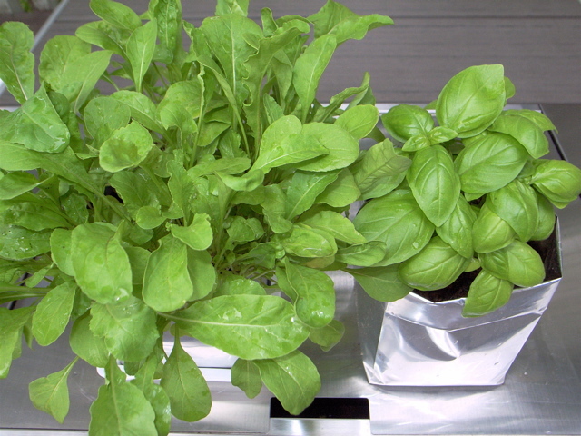 庭で採れた種から発芽したルッコラ、比較用の市販の種のバジルとも、順調に育っています。「庭の虫退治」コーナのニームのおかげか、虫食いもありません。