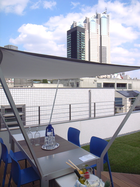 この屋上からの眺めは、まさに首都東京を思わせる絶景といってもいいでしょう。クッキンガーデンのシェード越しにそびえる高層ビルの姿は、青く塗られた壁面と青の椅子とあいまって、さながらフランスSF映画「ゴッド・ディーバ」の一場面のようです。