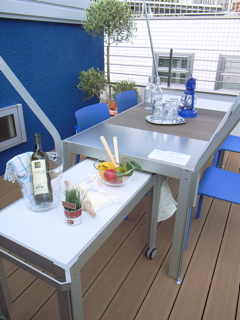 クッキンガーデン関係の展示品は、テーブル(T1608C)、ワゴン(W8040C)、マジス社の椅子(Air-Chair、Folding Air-Chair)です。