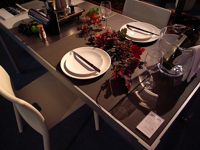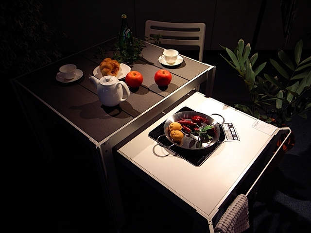 写真左上は、来年から発売開始になるIH組込み型のワゴンW6060H(手前)と小型のクッキンガーデンテーブルT8080です。右上は、T1608Cです。