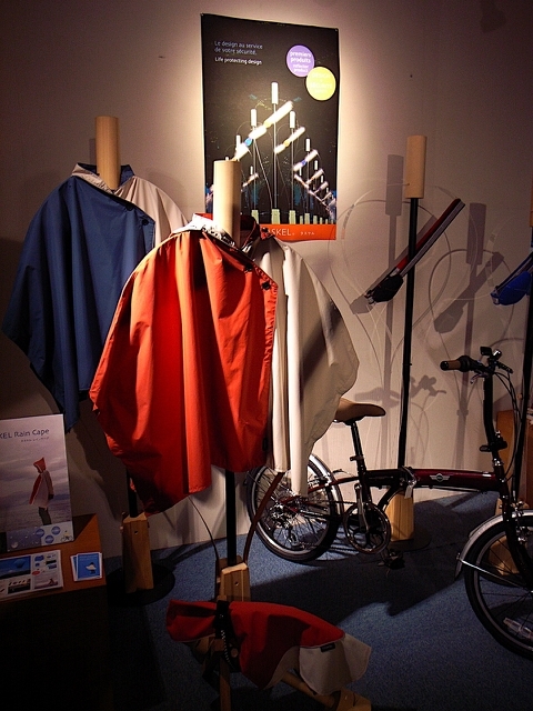 左下は、タスケルの展示です。写真のレインケープは、2010年の1月にフランスで開催される「メゾン・エ・オブジェ」に出展を予定しています。右下は、エンブレムポストのシリーズです。