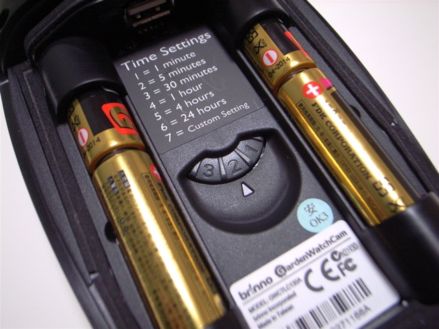 写真上段は、パッケージの外観と内容構成です。裏蓋を開けると、付属のバッテリー(単三4本)とUSBメモリー(2GB)が見えます。USBメモリを外すとプラスチック製のダイヤルがあり、これを回転させることで撮影間隔を変更することができます。