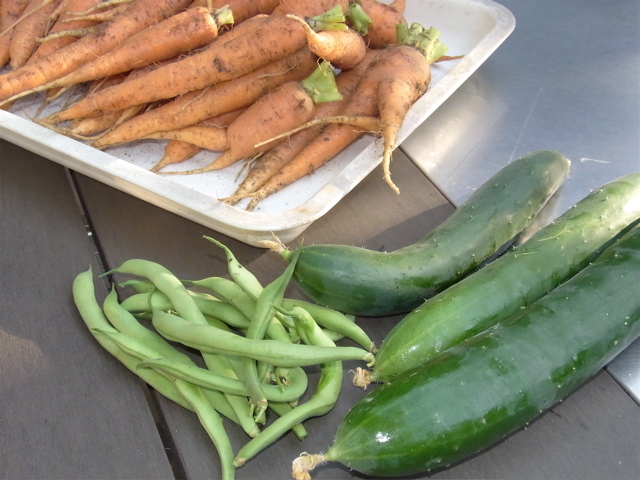 ついでに、デッキの上のプランターで採れ続けているキュウリとインゲンも収穫しました。こちらのキュウリは育ち過ぎ。重さ325グラム、長さ30センチ弱。まるでズッキーニです^^;