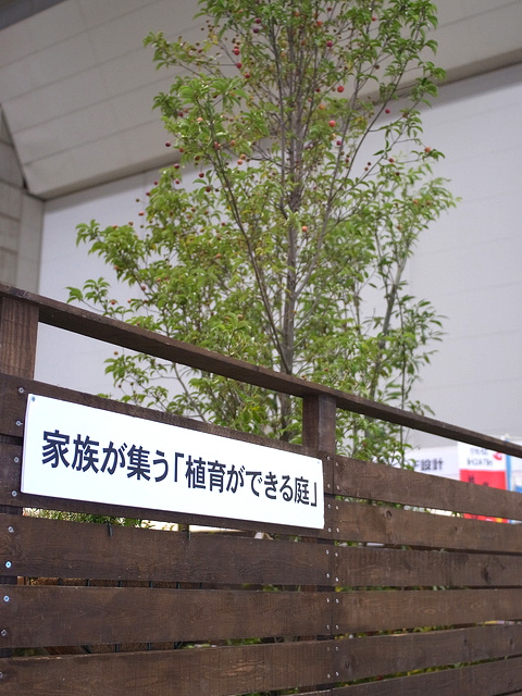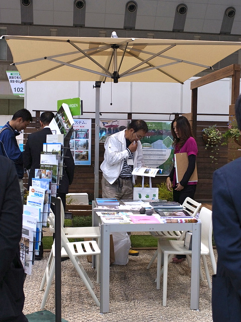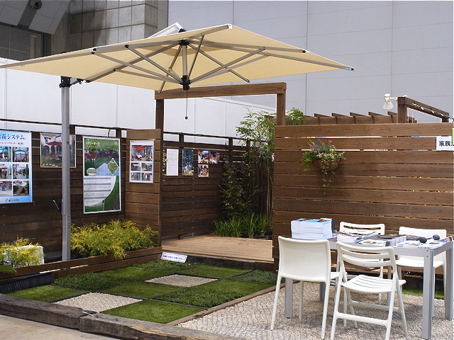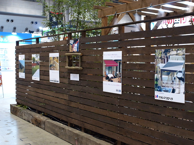 左下は東京ガスさんのブースです。東京ガスのパワー全開といった状況だった前の週の「住まいのリフォーム博」とは一変し、とても穏やかで優しさの感じられるブースデザインです。テーマは「時空をつなぐ二世帯のスローライフの家」。屋内空間と庭を融合し、庭ごはんも考慮した展示に、とても親近感を覚えました。