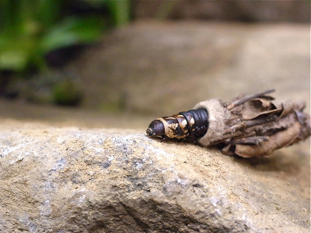 ミノムシもいました。たぶん、木にくっついてやってきたのでしょうね。石の上を彷徨っている様子だったので、ヤマボウシの小枝に移してやりました。ちゃんと、しがみついてお国に帰ったかな^^