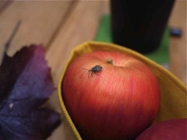 なんと、テーブルの林檎の上にはカメムシも! これはどこから来たのだろう。カメムシは行動範囲というか飛行範囲が広いので、もしかしたらお台場育ちでしょうか?