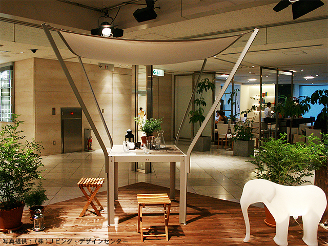 写真は、3階OZONEプラザで開催中の「子どもの"すき"を育てる展」に展示されているクッキンガーデン(T8080テーブルとシェード)の様子です。